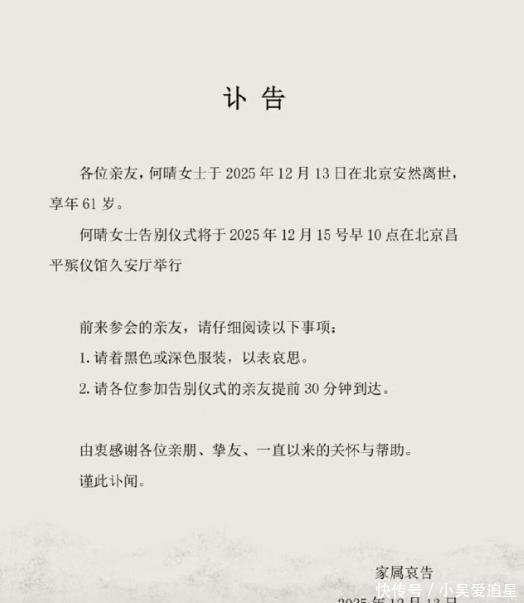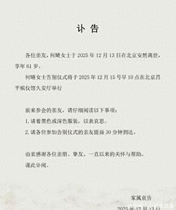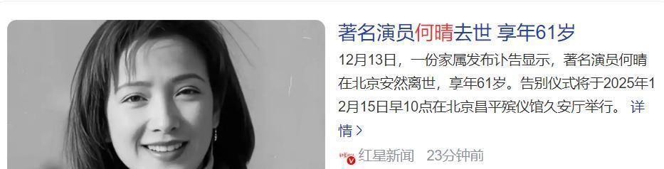 12月13号娱乐圈突然传来消息,何晴去世了,61岁。家属说是因病走的,告别仪式定在北京昌平殡仪馆,15号早上举行。这事儿让很多人震惊,因为之前没人听说她生病,连她演过的剧里搭档六小龄童都在朋友圈发了悼念。